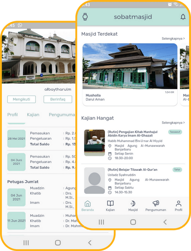 Sobat Masjid adalah aplikasi yang menghubungkan antara pengurus Masjid dan masyarakat untuk andil memakmurkan masjid. Kami memiliki visi menjadi aplikasi bertema Masjid nomor 1 di Indonesia dan slogan andalan “Aplikasi Memakmurkan Masjid”. Berikut manfaat yang kami berikan: